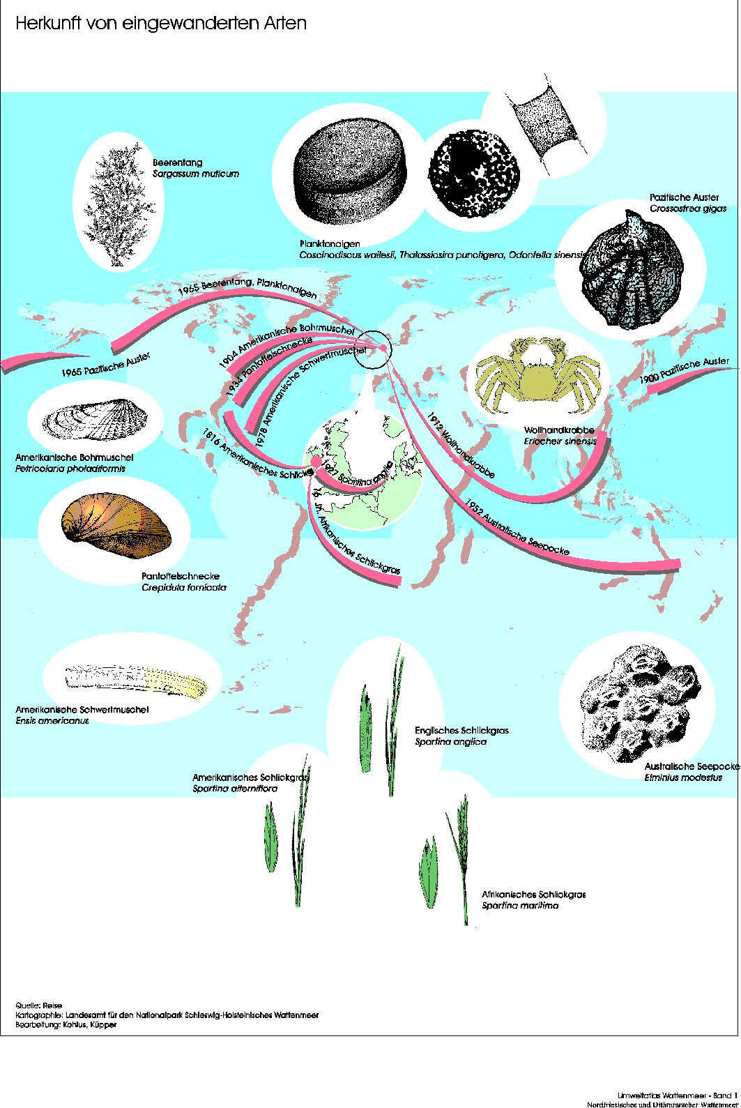 Umweltatlas Wattenmeer Bd. 1Ulmer Verlag, Hrsg. vom Landesamt für den Nationalpark Schleswig-Holsteinisches Wattenmeer & Umweltbundesamt, Red.:Jörn Kohlus & Hila KüpperKarte zum Beitrag "Arten aus der Fremde im Wattenmeer" |